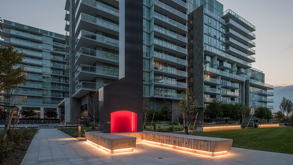 Fireside imagines what would be left standing in the aftermath of the fire at the historic Brighouse homestead. A 20 foot tall steel chimney stands as the main portion of the artwork. A backlit fuchsia fireplace is inset into the structure of the chimney while a large cedar bench surrounds the entire installation.